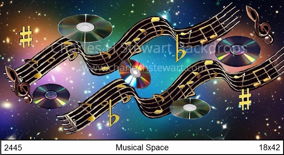 This Musical Space Backdrop shows tumbling CDs and musical notes set against a colorful space background.